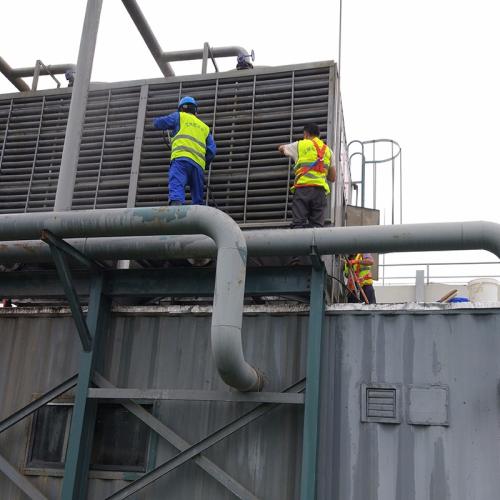 冷卻塔清理,由于冷卻塔暴露于大氣中,運(yùn)行過程中會有大量的泥沙、藻類等附著于冷卻塔填料表面,不清理干凈會在以后的運(yùn)行中將這些污垢沖洗到冷卻器內(nèi)造成冷卻器內(nèi)熱交換銅管的堵塞,影響熱交換效果,所以必須對冷卻塔進(jìn)行徹底清理。